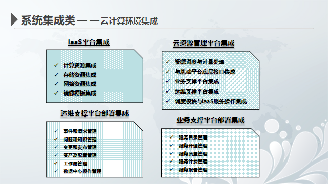 我公司一直結合信息產業的發展趨勢和自身業務的優勢,將公司戰略聚焦于IT服務、系統集成等領域,致力于打造一條完整而強大的“系統集成”產業鏈,向云計算、移動互聯網和大數據處理等信息技術行業應用領域 全面深入,成為集 現代信息系統研發、建設、運營、維護于一體的全產業鏈服務提供商。目前,公司的核心業務基本覆蓋IT服務的重要領域:硬件方面能提供智能網絡設備、存儲系統、全系列服務器等為主的先進設備。軟件方面提供從桌面端到移動端的應用軟件解決方案。技術服務方面涵蓋技術咨詢、基礎設施解決方案和支持服務。我公司有能力為任何大型客戶的信息化需求提供完整、領先的IT集成服務。服務的內容具體包括硬件系統集成服務、軟件系統集成服務和云計算環境集成服務。